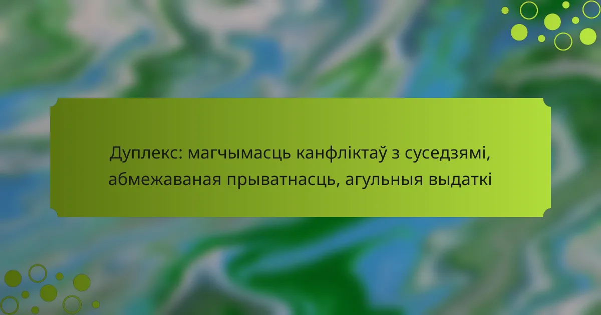 Дуплексы прапануюць унікальныя магчымасці для сумеснага пражывання, аднак яны таксама могуць стаць крыніцай канфліктаў з суседзямі з-за абмежаванай прыватнасці і агульных выдаткаў. Для зніжэння напружанасці важна наладжваць адкрытую камунікацыю і ясныя дамоўленасці. Акрамя таго, улічэнне акустычнай ізаляцыі і арганізацыі прыватных зон можа значна палепшыць якасць жыцця ў дуплексах.